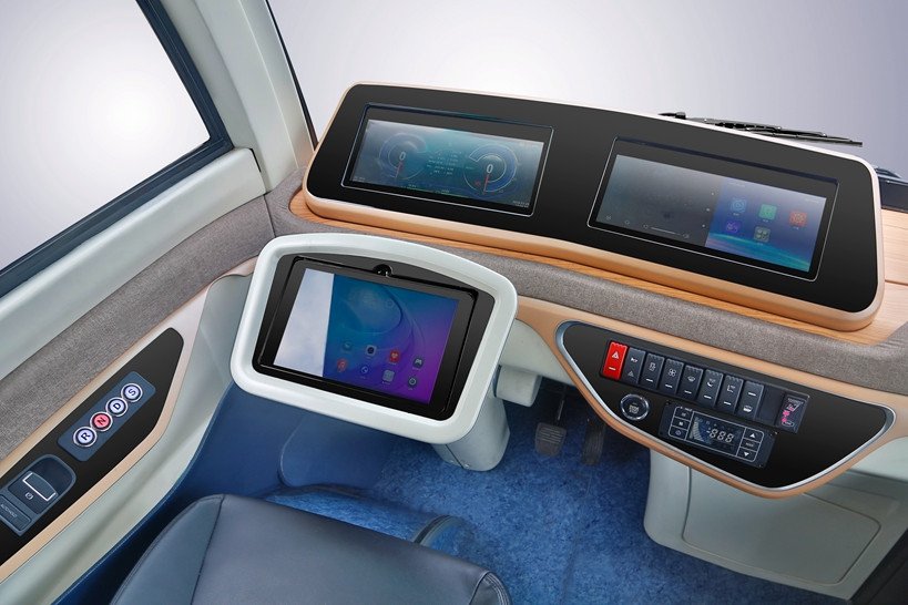 À l’intérieur, deux écrans LED de 32 pouces diffusent des informations de conduite, des alertes de sécurité ainsi que des contenus de divertissement, offrant ainsi une expérience de voyage à la fois sûre et agréable.